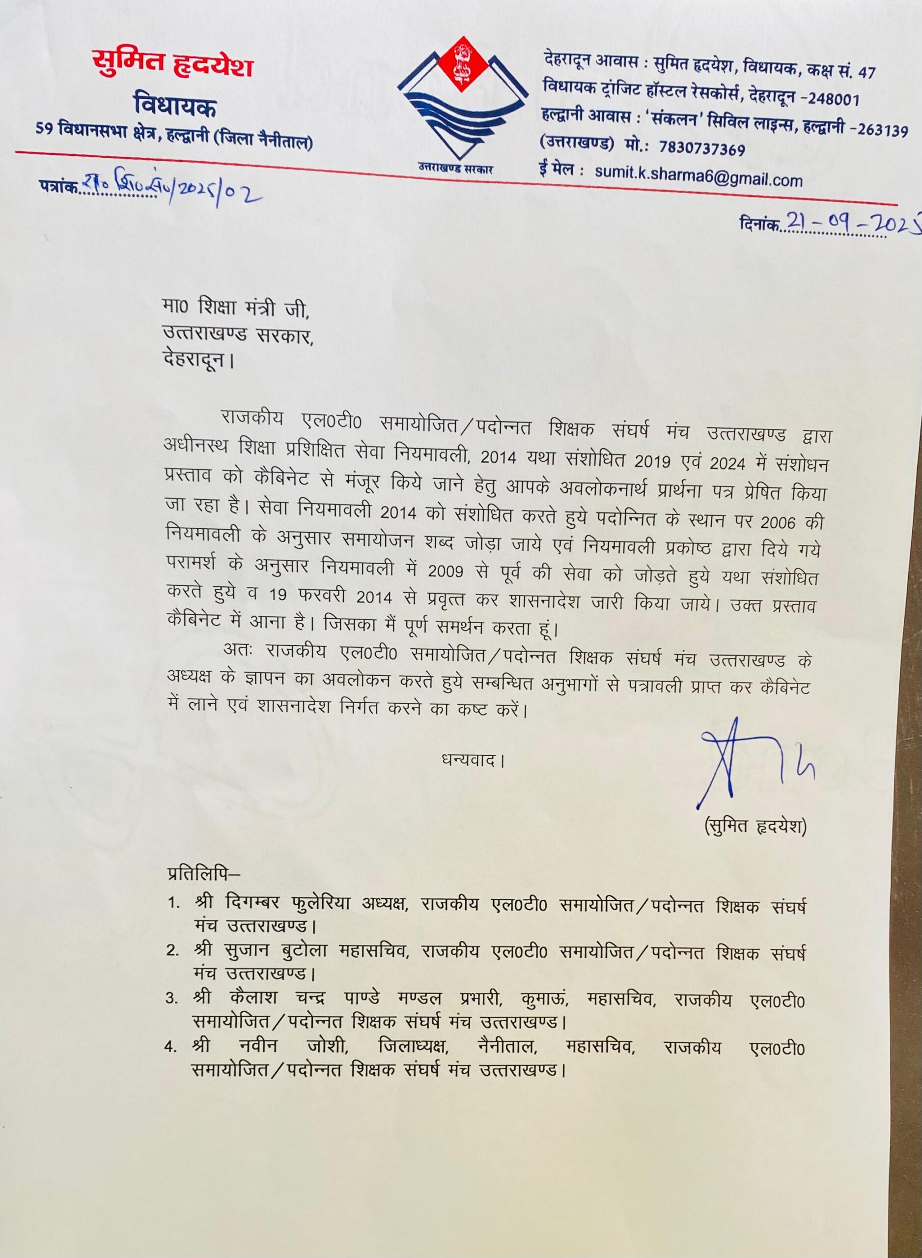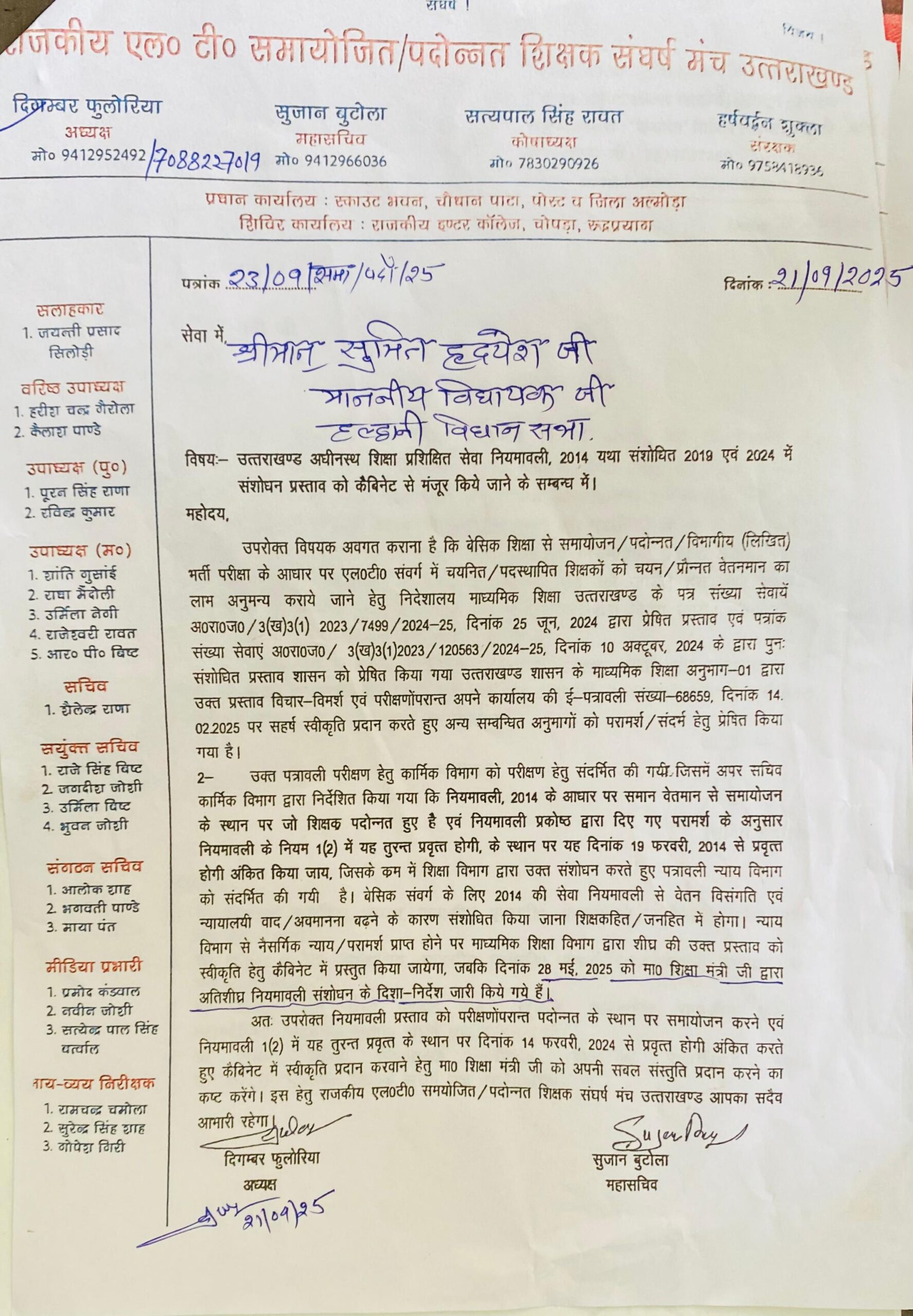 आज उनके आवास पर राजकीय एल.टी. समायोजित/पदोन्नत शिक्षक संघर्ष मंच उत्तराखण्ड के शिष्टमंडल ने भेंट कर अपनी समस्याओं और मांगों से अवगत कराया। शिष्टमंडल ने अधीनस्थ शिक्षा प्रशिक्षित (एल.टी.) सेवा नियमावली 2014, संशोधित नियमावली 2019 और वर्ष 2024 में प्रस्तावित संशोधनों से जुड़ा ज्ञापन विधायक को सौंपा।