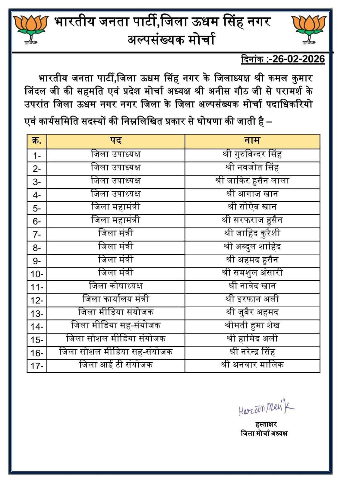 उधम सिंह नगर में भाजपा अल्पसंख्यक मोर्चा की नई जिला कार्यकारिणी घोषित