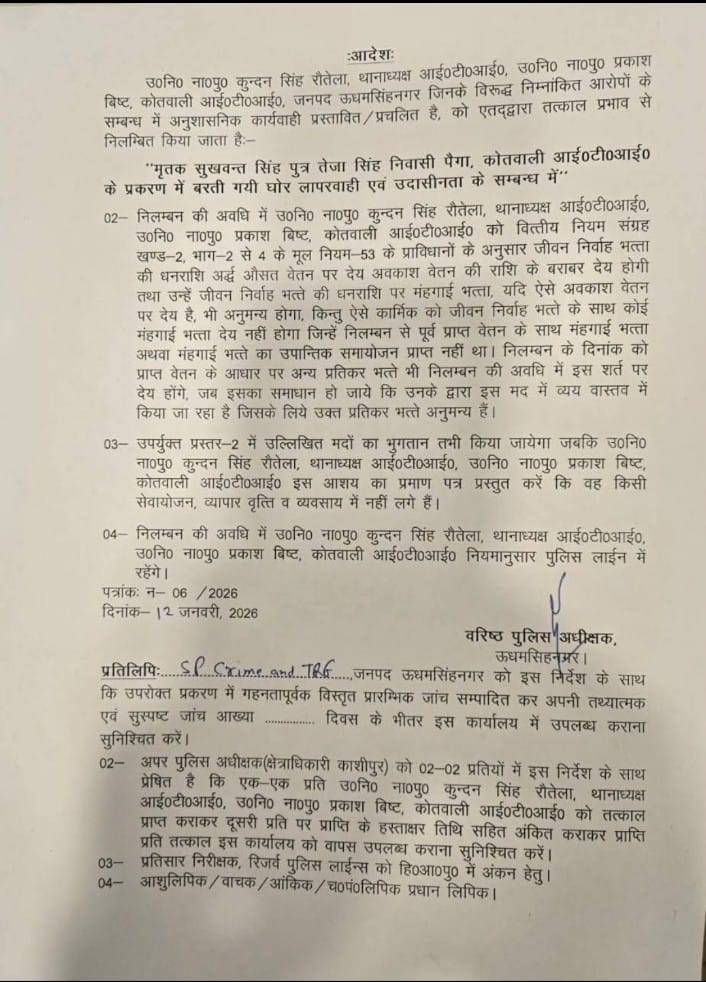 वरिष्ठ पुलिस अधीक्षक मणिकांत मिश्रा ने आईटीआई थाना प्रभारी कुंदन सिंह रौतेला, उपनिरीक्षक प्रकाश बिष्ट और चौकी प्रभारी पैगा जीतेन्द्र कुमार सहित नौ हेड कांस्टेबल और सिपाहियों को तत्काल प्रभाव से सस्पेंड कर दिया है, गौरतलब हो कि इस मामले की जांच बाजपुर के पुलिस उपाधीक्षक को सौंपी गई है, वहीं दूसरी तरफ मृतक किसान सुखवंत सिंह को आज सुपुर्द खाक कर दिया गया है, उनकी आत्महत्या मामले में विभिन्न सामाजिक राजनीतिक संगठनों ने शौक व्यक्त किया है।