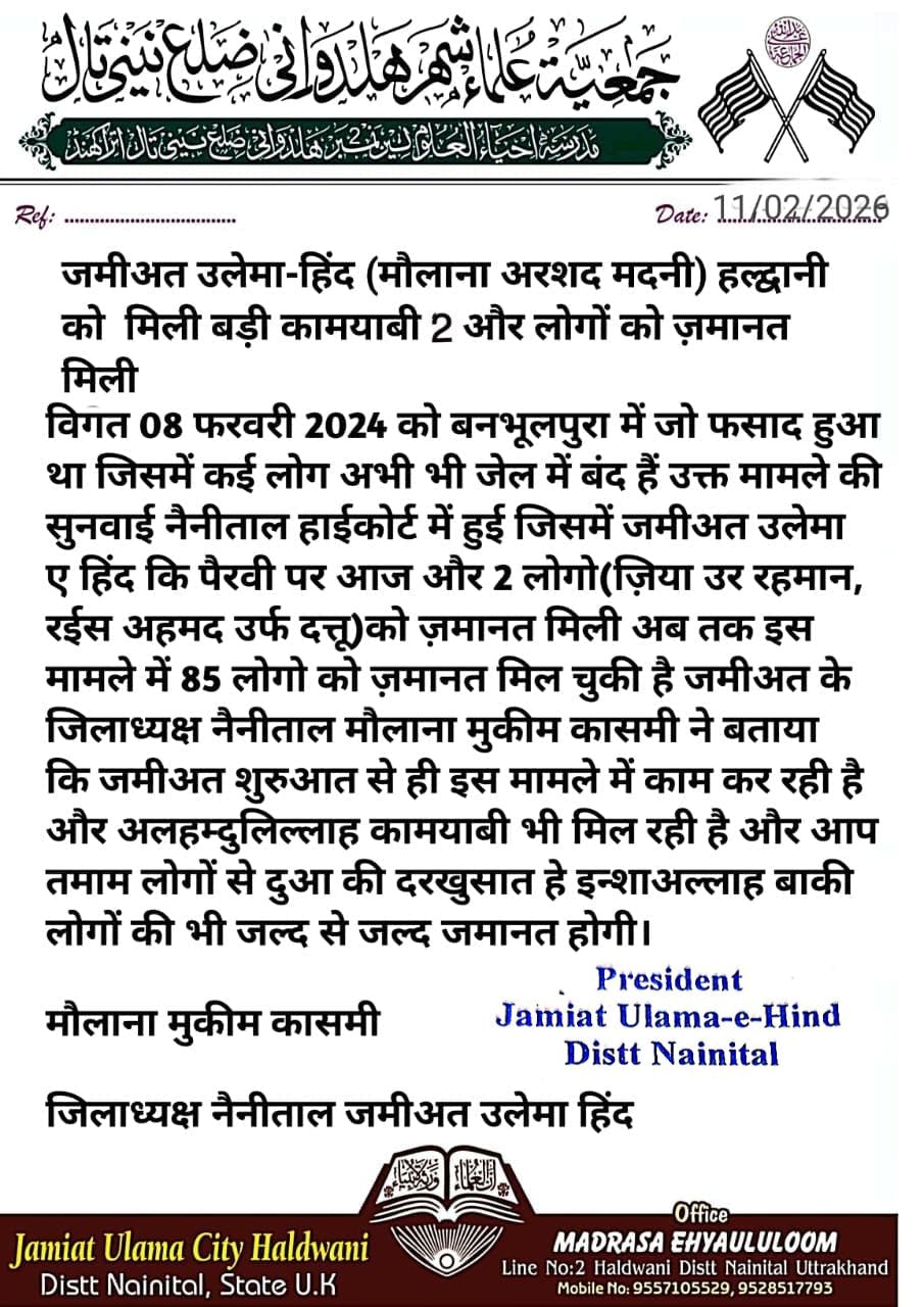 जमीअत उलेमा-ए-हिंद के नैनीताल जिलाध्यक्ष मौलाना मुकीम कासमी ने बताया कि संगठन प्रभावित लोगों को कानूनी सहायता उपलब्ध कराने के लिए प्रतिबद्ध है।