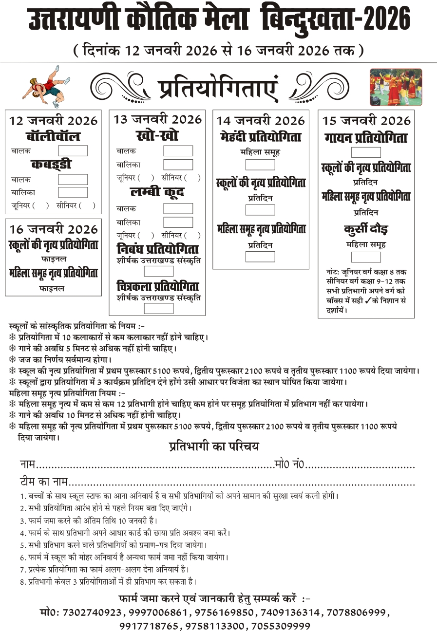 समिति के अध्यक्ष दीप जोशी ने बताया कि प्रतियोगिताओं में भाग लेने के लिए फॉर्म जमा करने की अंतिम तिथि 10 जनवरी 2026 तय की गई है। फॉर्म के साथ आधार कार्ड की छायाप्रति जमा करना अनिवार्य होगा। प्रत्येक प्रतिभागी अधिकतम तीन प्रतियोगिताओं में ही भाग ले सकेगा। फॉर्म जमा करने एवं अधिक जानकारी के लिए आयोजकों द्वारा जारी संपर्क नंबरों पर संपर्क किया जा सकता है।